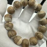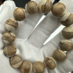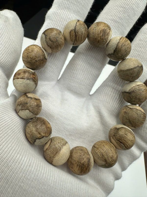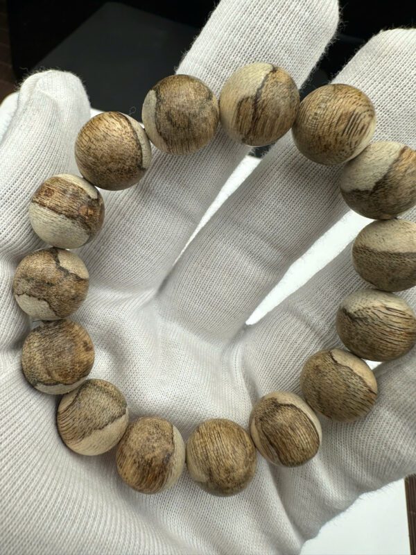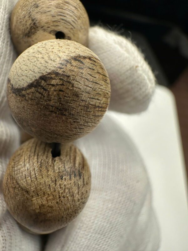 As seen in the high-resolution imagery, this particular Agarwood bracelet VietNam showcases a stunning “Tiger” grain pattern. The base wood features a creamy, golden-tan hue, beautifully contrasted by deep, dark resinous veins that meander through each bead. These irregular oil lines are a testament to the years of natural formation, indicating a high concentration of aromatic resin.